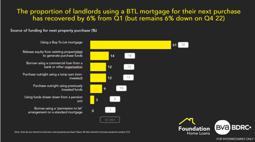 The proportion of landlords using a BTL mortgage for their next purchase has recovered by 6% from Q1 figures (but remains 6% down on Q4 22). The proportion of landlords sourcing funding from a commercial loan remains stable at 12%.